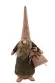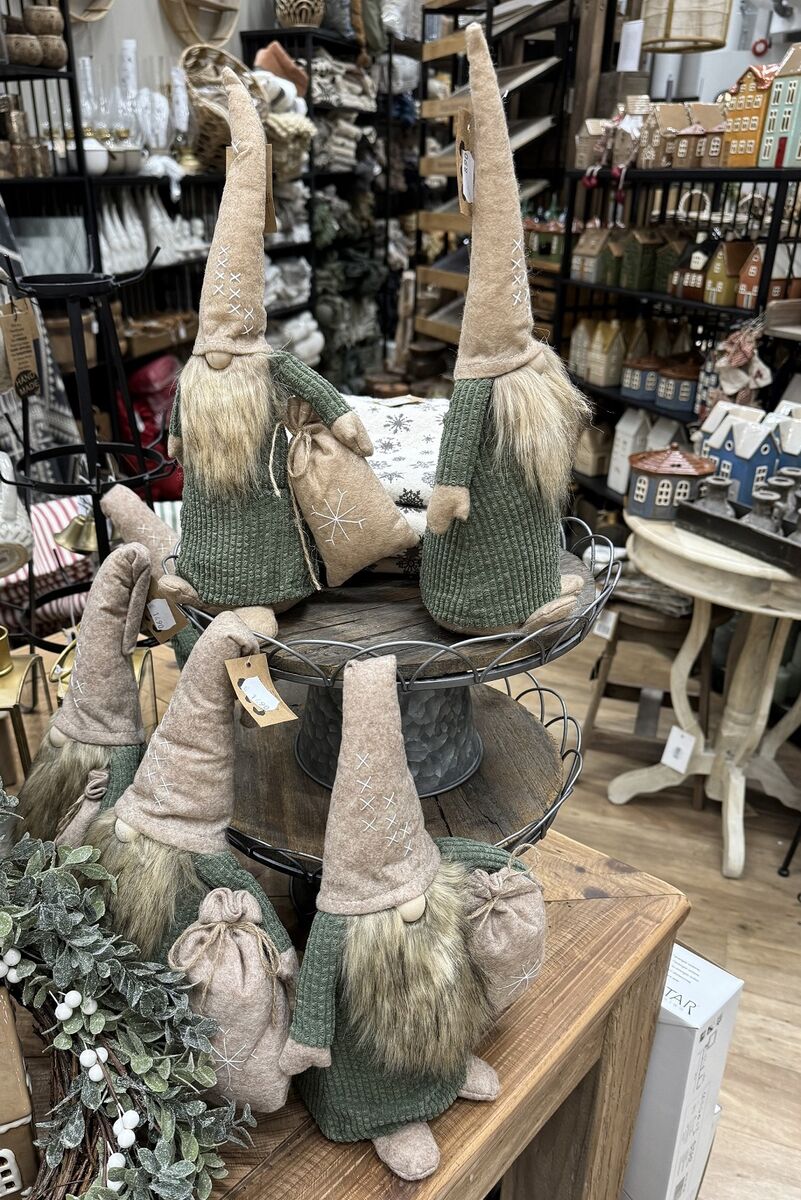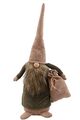 Kaksi eri kokoista vihreään kaapuun ja beigeen tonttulakkiin puettua joulupukkia, jotka kantavat kainalossaan lahjapussia.