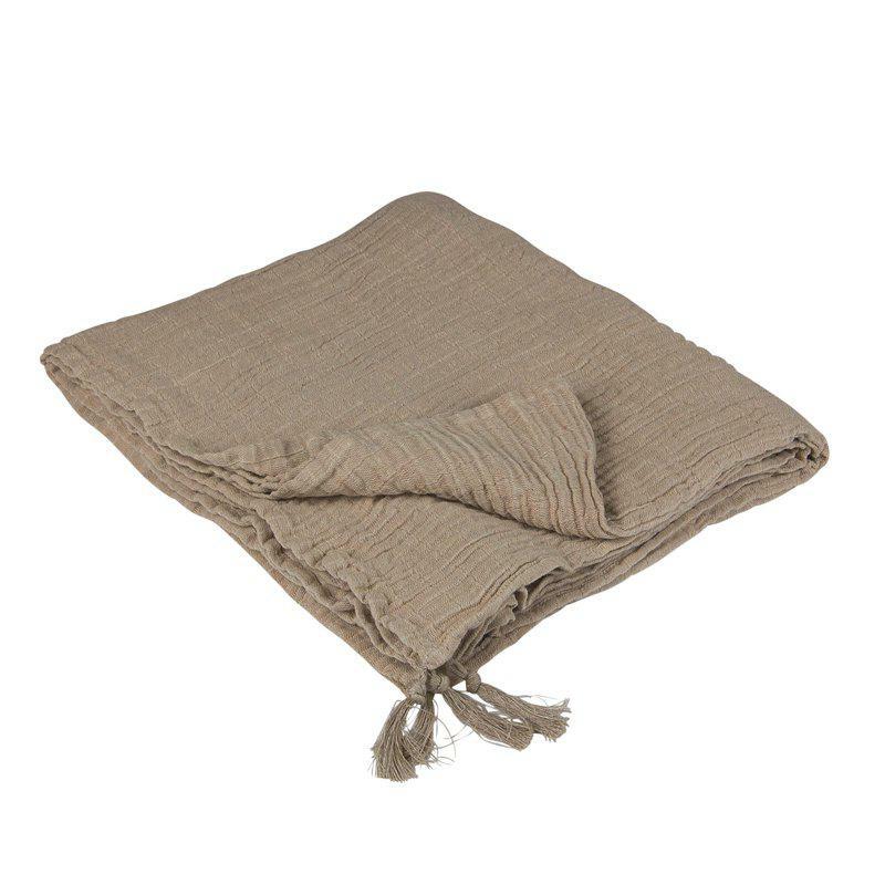 Puuvillasta valmistettu torkkupeitto, jossa kevyt rypytys pinnassa. Jokaisessa kulmassa pieni hapsukoriste.
