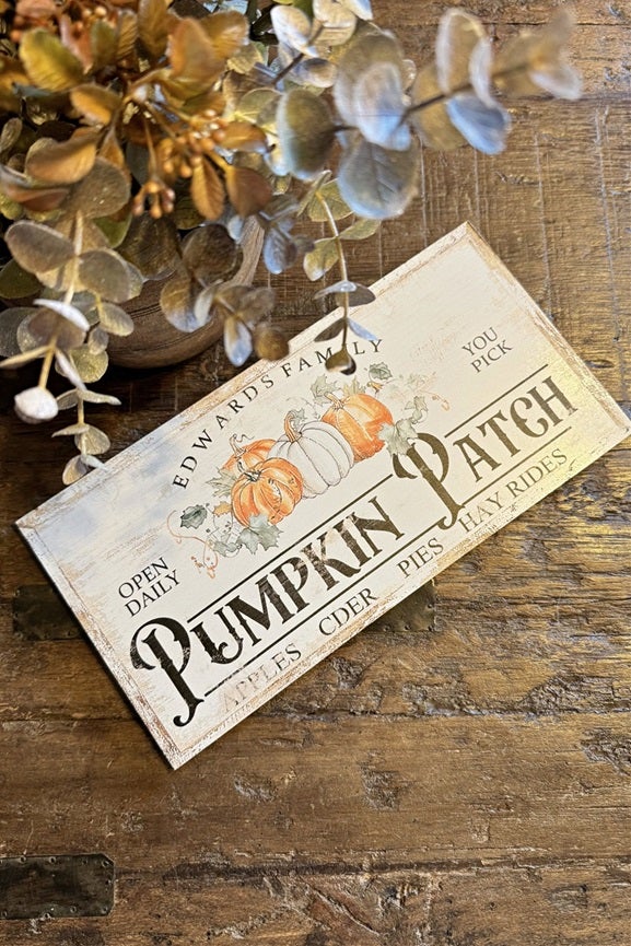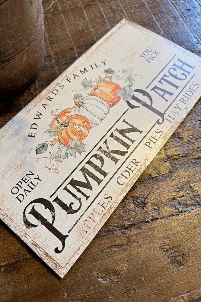 Kyltin pohjasävynä on rustiikkinen luonnonvalkoinen, jota koristaa kuluneen näköinen vintage-patinointi. Keskellä kylttiä on kauniit kurpitsat syksyn väreissä. Yläosaan on painettu nimi "Edwards Family" ikään kuin kyltti olisi aidosta amerikkalaisesta maatilasta. Suurimmalla fontilla erottuu sanat "Pumpkin Patch".