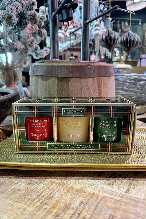 Kolme eri värisiin lasiastioihin valettua kynttilää, joissa jouluisia tuoksuja. Kynttilät pakattu tyylikkääseen värikkääseen pakkaukseen, jossa kynttilät voi antaa vaikkapa joululahjaksi.