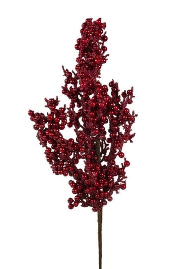 Kaksi eri kokoista koristeoksaa, jossa punaisia marjoja. Voidaan käyttää kimpuissa tai osia voi irrottaa esimerkiksi kranssien tekoon.