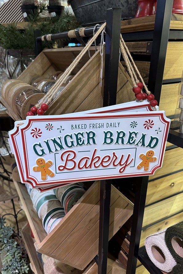 Hauska joulutunnelmaa luova metallikyltti, jossa teksti Gingerbread Bakery. Kyltissä valmiina juuttinauha, josta sen voi ripustaa. Juuttinauhassa koristeena myös punaiset puuhelmet.