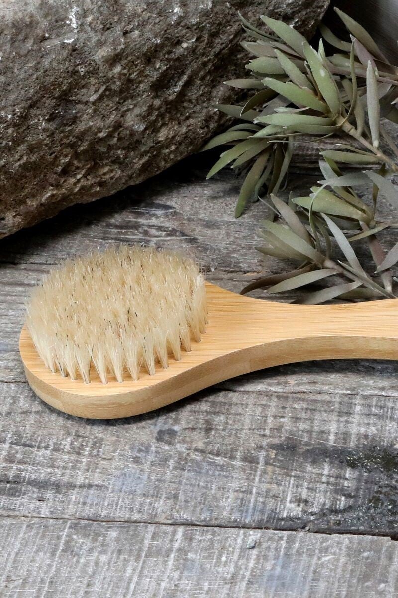 Tukeva varrellinen pesuharja, joka on valmistettu bambusta ja luonnonharjaksesta. Varressa puuvillanyöri, josta harja on helppo ripustaa kuivumaan.