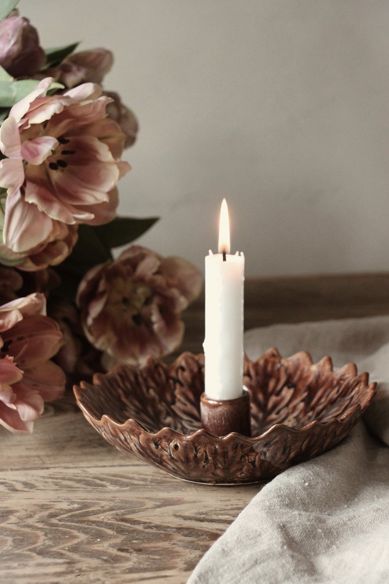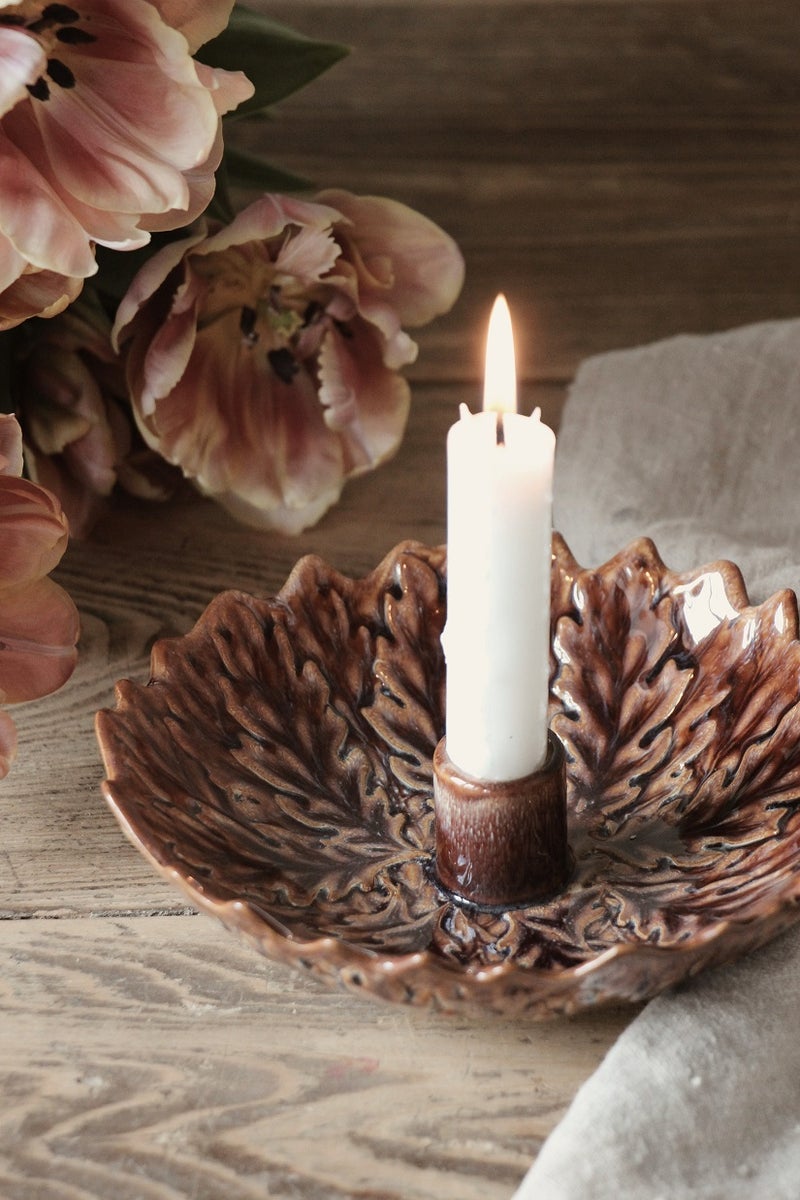 Luo lämpöä ja luonnonläheistä tunnelmaa kotiisi tällä upealla kynttilänjalalla, jonka muoto on saanut inspiraationsa luonnosta – sen leveä, koristeellinen lautanen muistuttaa tammenlehteä ja pintaa koristaa elävä, orgaaninen lehtikuvio, jonka yksityiskohdat korostuvat kauniisti reaktiivisen lasitteen ansiosta.