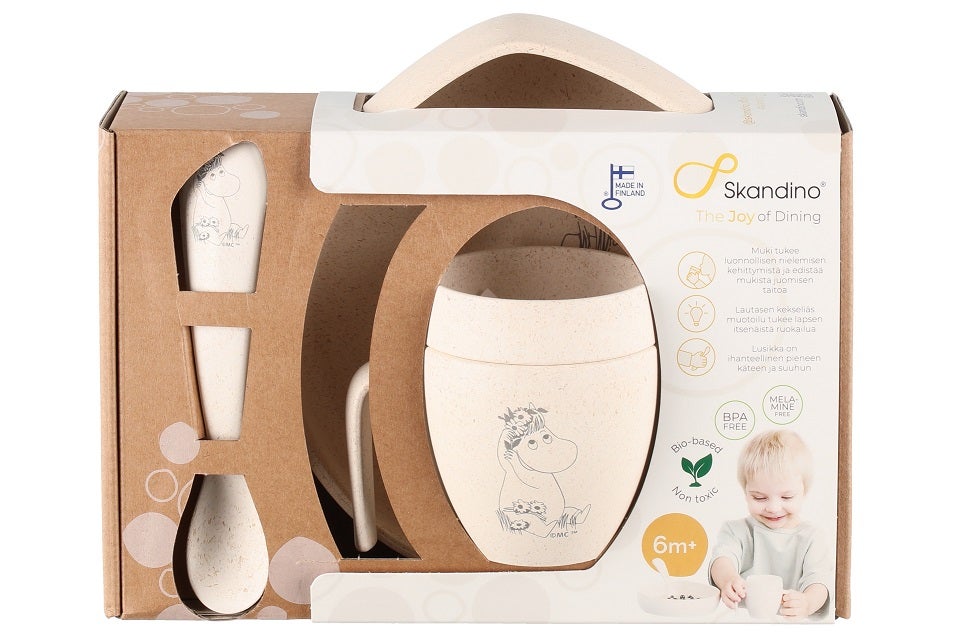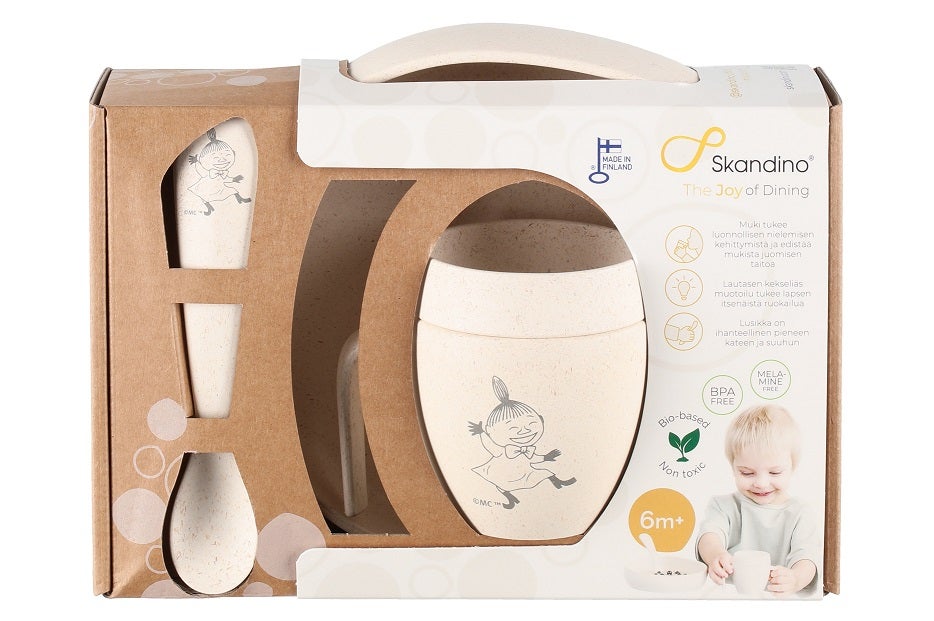 Tuo ruokailuhetkiin ripaus satumaailmaa Skandino® Muumi-astiastolla! Suomessa valmistettu ja asiantuntijoiden kanssa kehitetty Skandino®-lasten astiasetti yhdistää ekologisuuden, ergonomian ja ilon – rakastetuilla Muumi-hahmoilla koristeltuna.