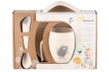 - Älykkäästi muotoillun lautasen, jossa on kalteva pohja ja pystysuorat reunat. Ruoka valuu lautasen kulmaan, josta se on helppo nostaa lusikkaan – täydellinen tuki itsenäisen ruokailun opetteluun.