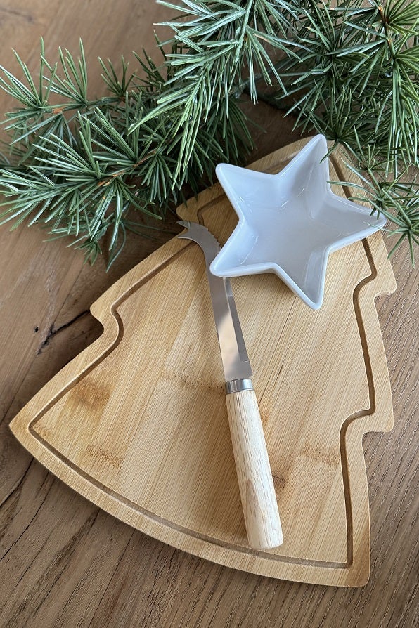 Tee joulun tarjoiluista entistäkin tunnelmallisempia upealla bambusta valmistetulla joulukuusen muotoisella tarjottimella. Setti sisältää myös pienen tähden muotoisen astian esimerkiksi dippikastikkeelle sekä puukahvaisen juustoveitsen – täydellinen kokonaisuus joulun herkkuhetkiin.