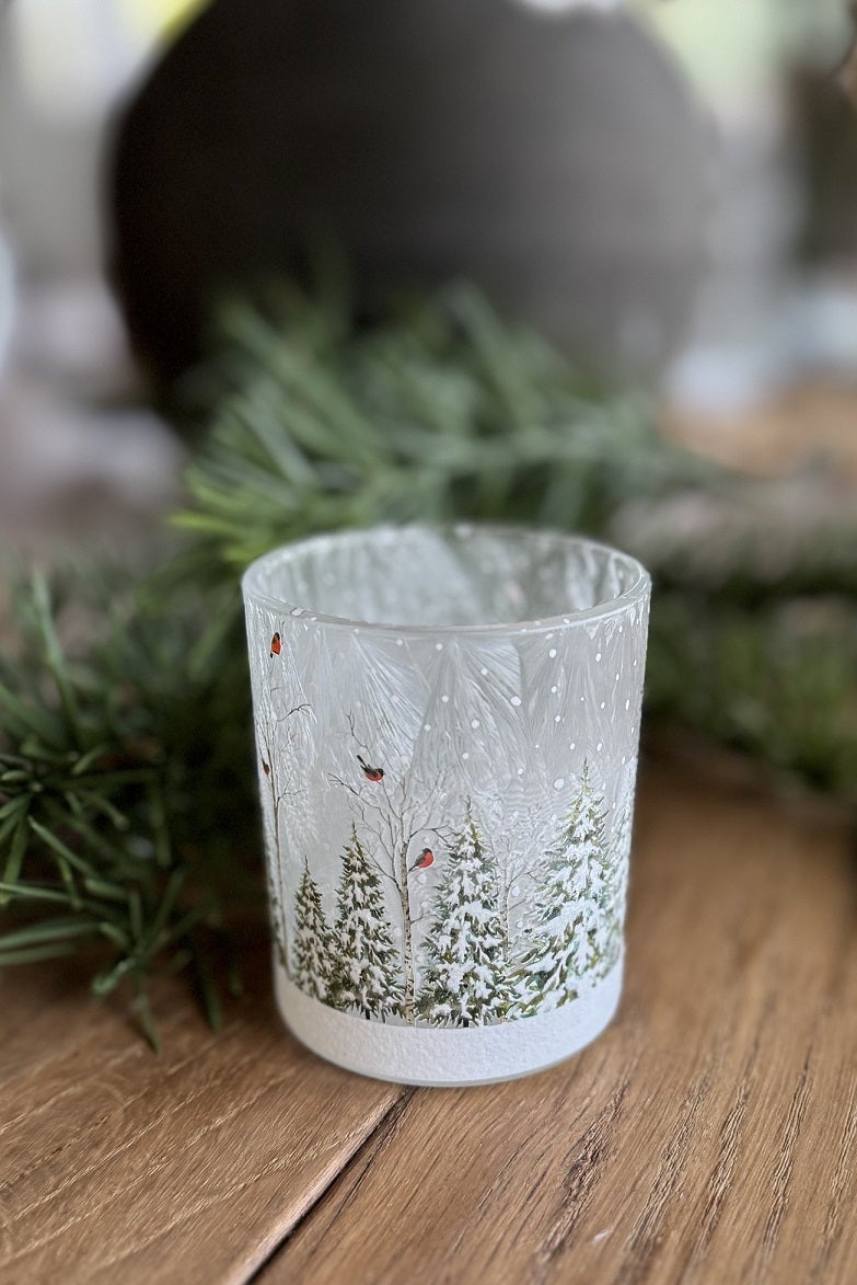 Tuo ripaus talven taikaa kotiin tällä pienellä Robin-tuikkulyhdyllä, jonka pinnalla avautuu luminen metsämaisema ja punatulkkujen rauhallinen parvi. Kuuranpeittämä lasipinta luo kauniin, jääkristallimaisen efektin ja lämmin kynttilänvalo hehkuu tunnelmallisesti kuvion läpi.