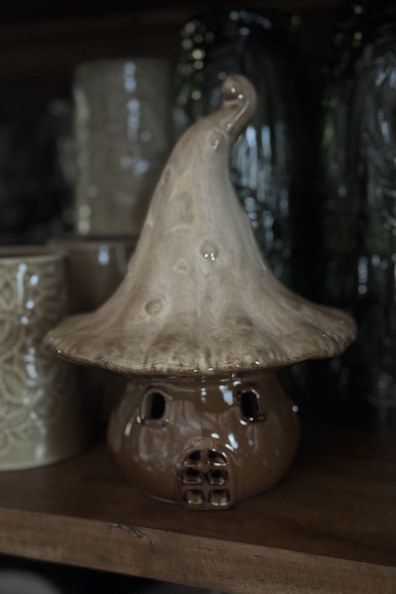 Hurmaava keraaminen lyhty on muotoiltu suloisen sienitalon muotoon ja viimeistelty kauniilla reaktiivisella lasitteella, joka tekee jokaisesta kappaleesta yksilöllisen. Sen pehmeät ruskean sävyt ja kiiltävä pinta tuovat luonnonläheistä lämpöä kotiin tai mökille.