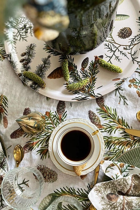 Luo pöydällesi tunnelma, joka huokuu pohjoisen metsän rauhaa! Pine Trees -kaitaliina on täydellinen valinta, kun haluat tuoda kattaukseen luonnon inspiroimaa tyyliä. Valkoisella pohjalla levittäytyvät kauniit havunoksat ja kävyt tuovat lämpöä ja kodikkuutta – sopii erinomaisesti niin arkeen kuin juhlaan, erityisesti talven ja joulun aikaan.