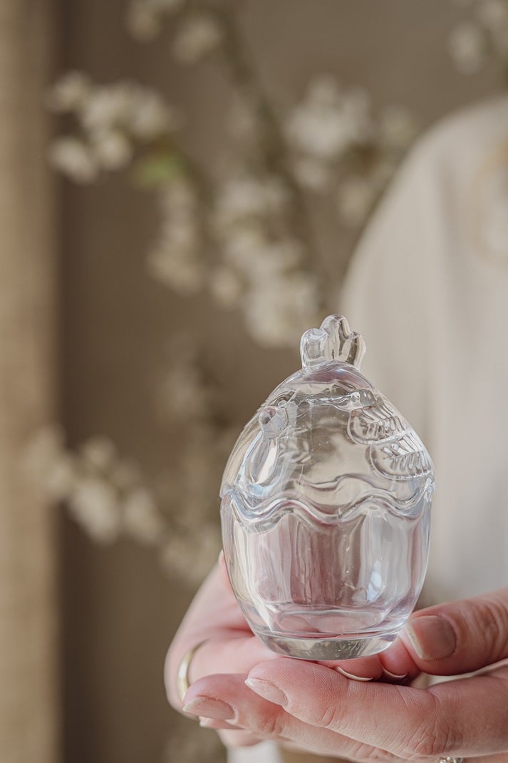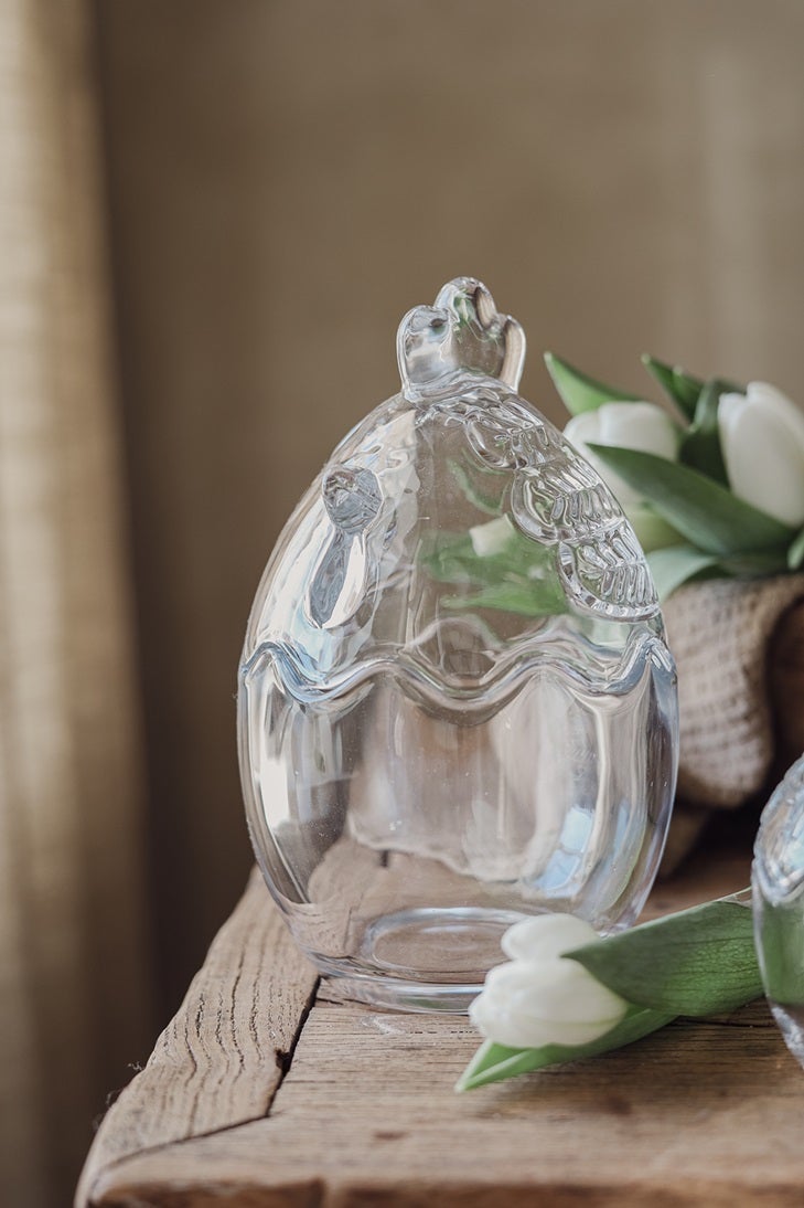 Kaunis lasiastia, joka tuo ripauksen maalaisromantiikkaa kotiin! Astia on muotoiltu kanan hahmoon ja siinä on irrotettava kansi, joka tekee siitä sekä käytännöllisen että koristeellisen. Sopii erinomaisesti esimerkiksi pääsiäiskoristeeksi, herkkujen tarjoiluun tai pienten esineiden säilytykseen.