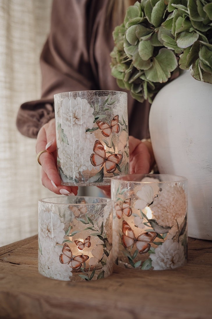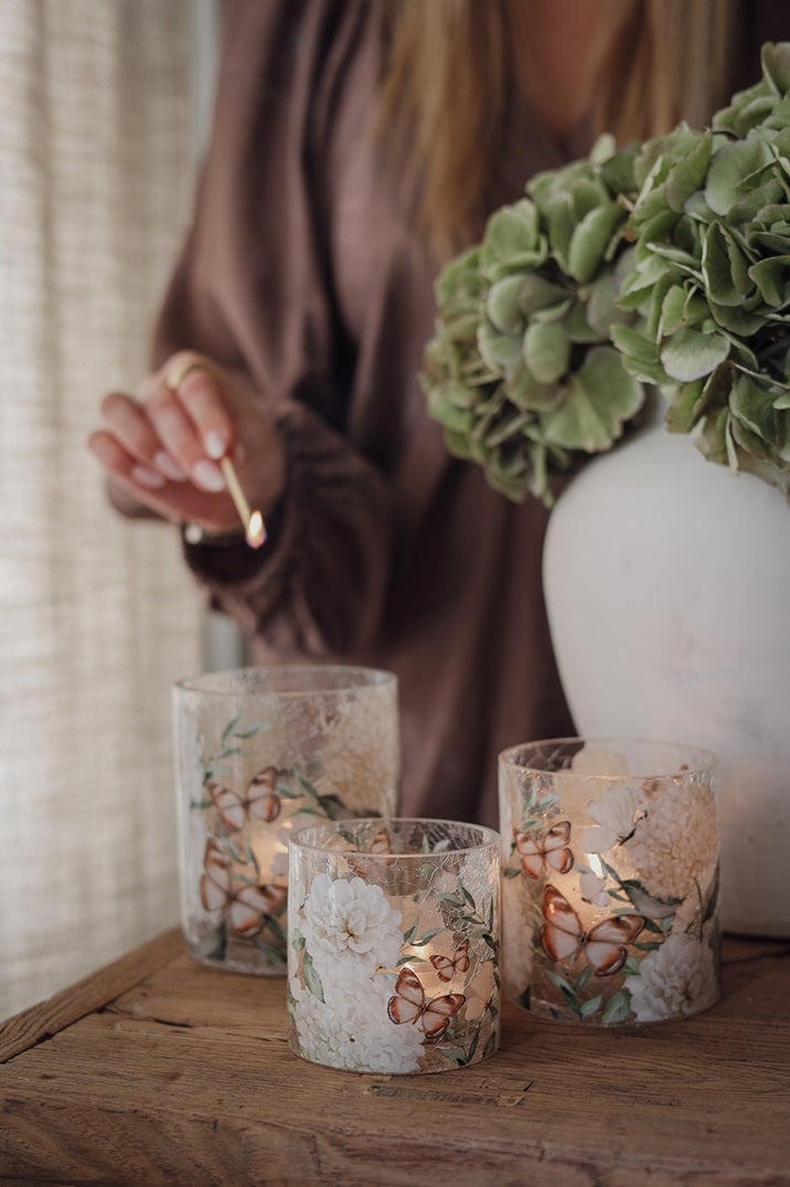 KYNTTILÄLYHTY HORTENSIA & BUTTERFLIES KOLMESSA KOOSSA