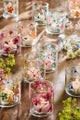Läpinäkyvän lasin ja värikkään kukkakoristelun yhdistelmä antaa kynttilänvalon hehkua kauniisti lyhdyn läpi, luoden pehmeän ja elävän valon. Lyhdyt ovat täydellinen valinta kesäpöydän kattauksiin, terassille, mökille tai tuomaan ripauksen kesää arjen keskelle.